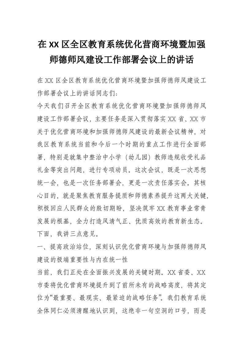 在XX区全区教育系统优化营商环境暨加强师德师风建设工作部署会议上的讲话