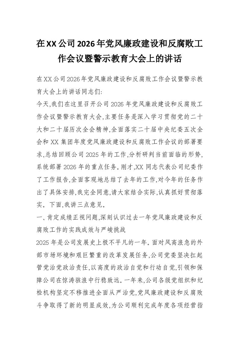 在XX公司2026年党风廉政建设和反腐败工作会议暨警示教育大会上的讲话