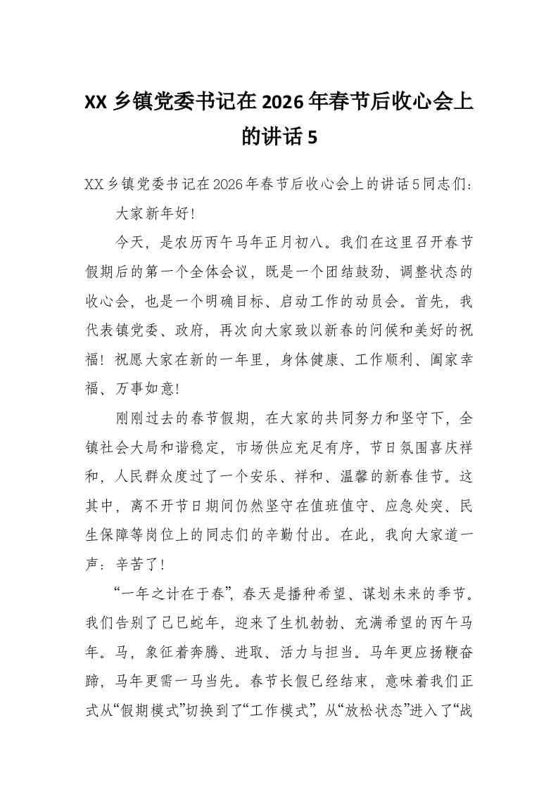 XX乡镇党委书记在2026年春节后收心会上的讲话5