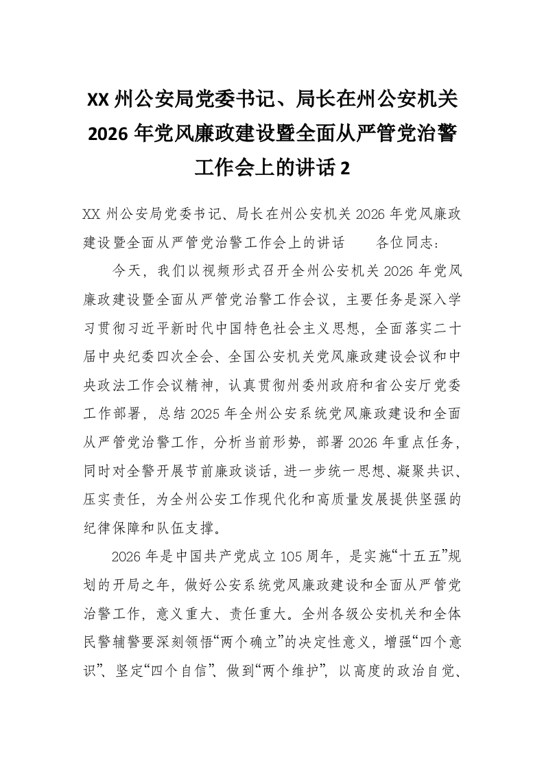 XX州公安局党委书记、局长在州公安机关2026年党风廉政建设暨全面从严管党治警工作会上的讲话2