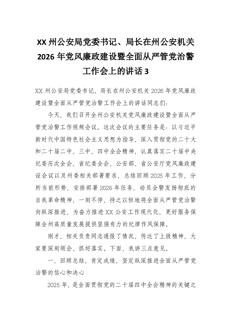 XX州公安局党委书记、局长在州公安机关2026年党风廉政建设暨全面从严管党治警工作会上的讲话3