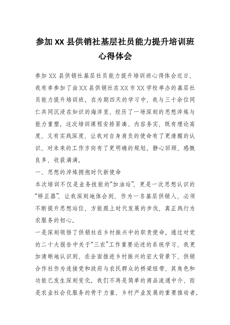 参加XX县供销社基层社员能力提升培训班心得体会