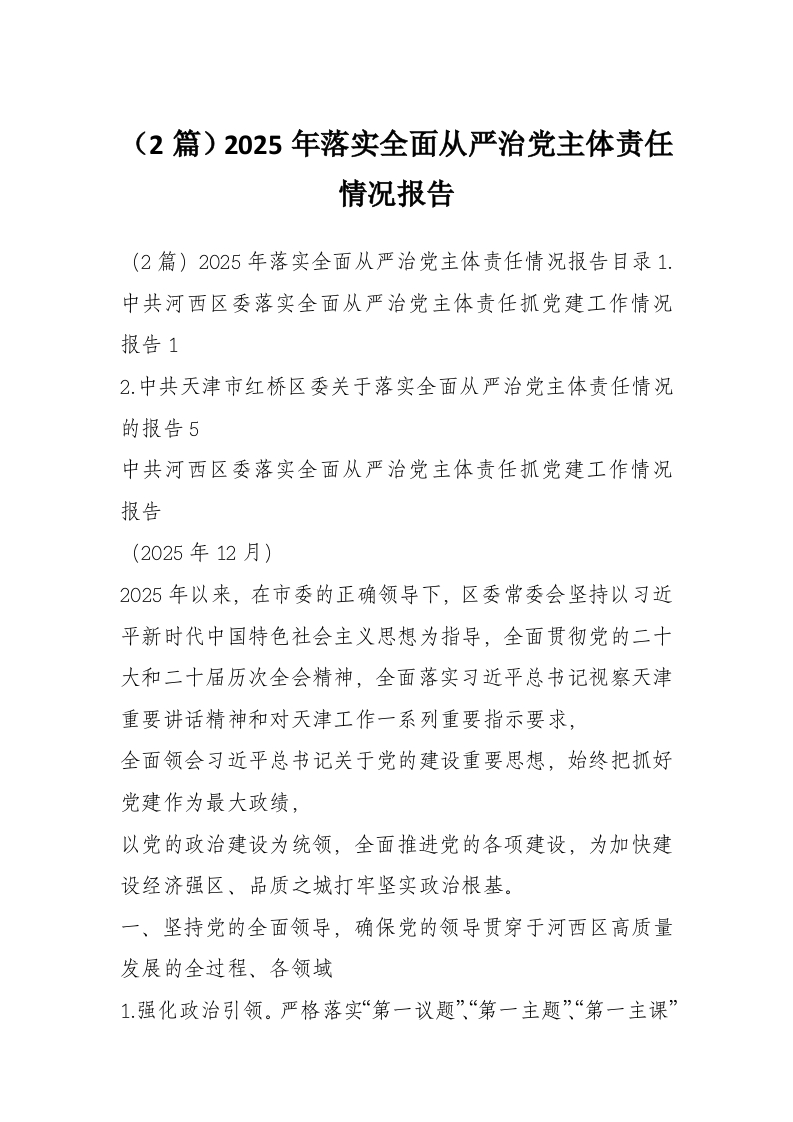 (2篇)2025年落实全面从严治党主体责任情况报告