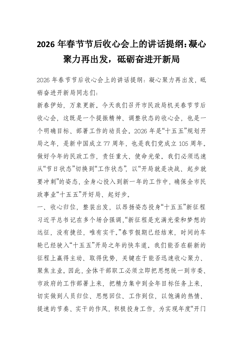 首页材料汇编2026年春节节后收心会上的讲话提纲:凝心聚力再出发,砥砺奋进开新局