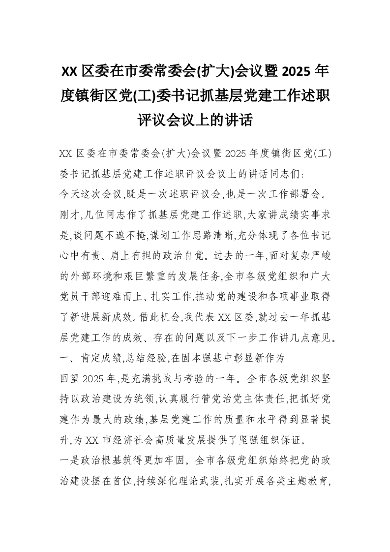 XX区委在市委常委会(扩大)会议暨2025年度镇街区党(工)委书记抓基层党建工作述职评议会议上的讲话