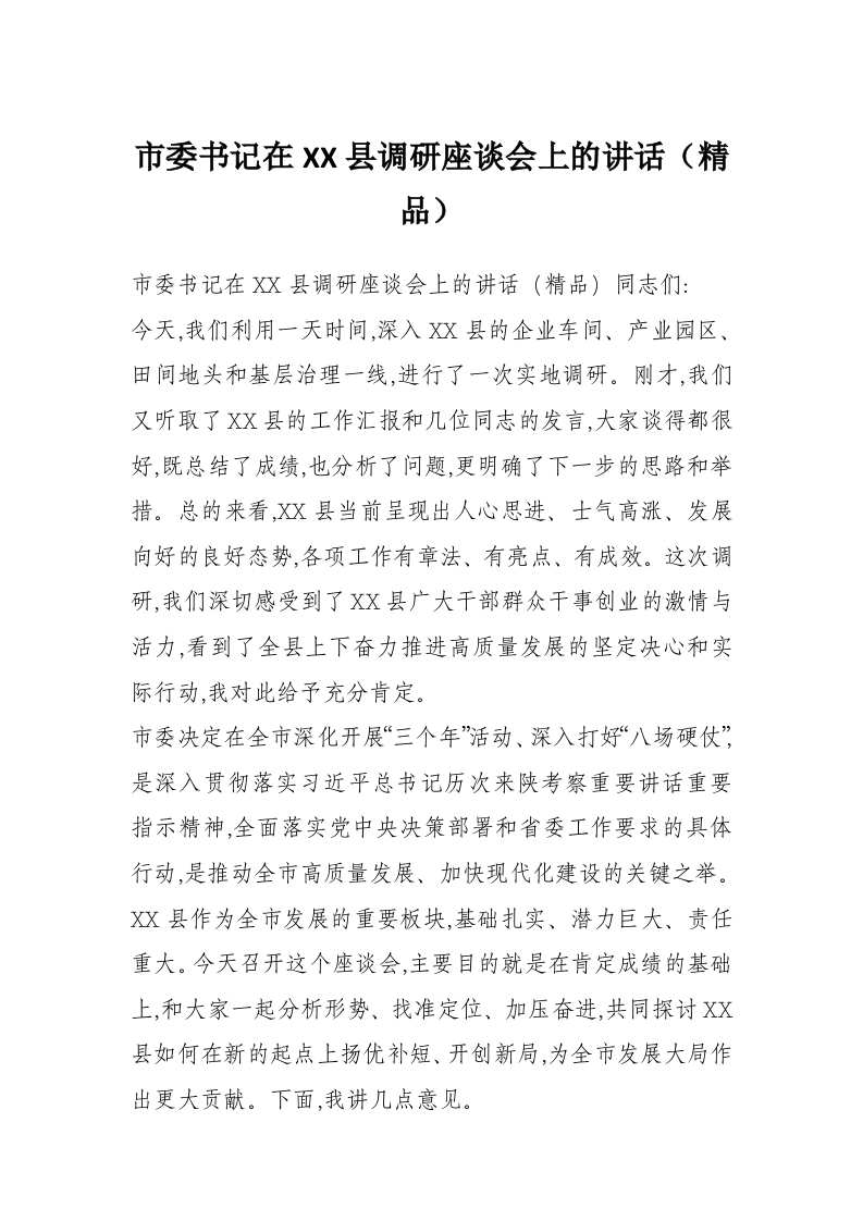 市委书记在XX县调研座谈会上的讲话(精品)