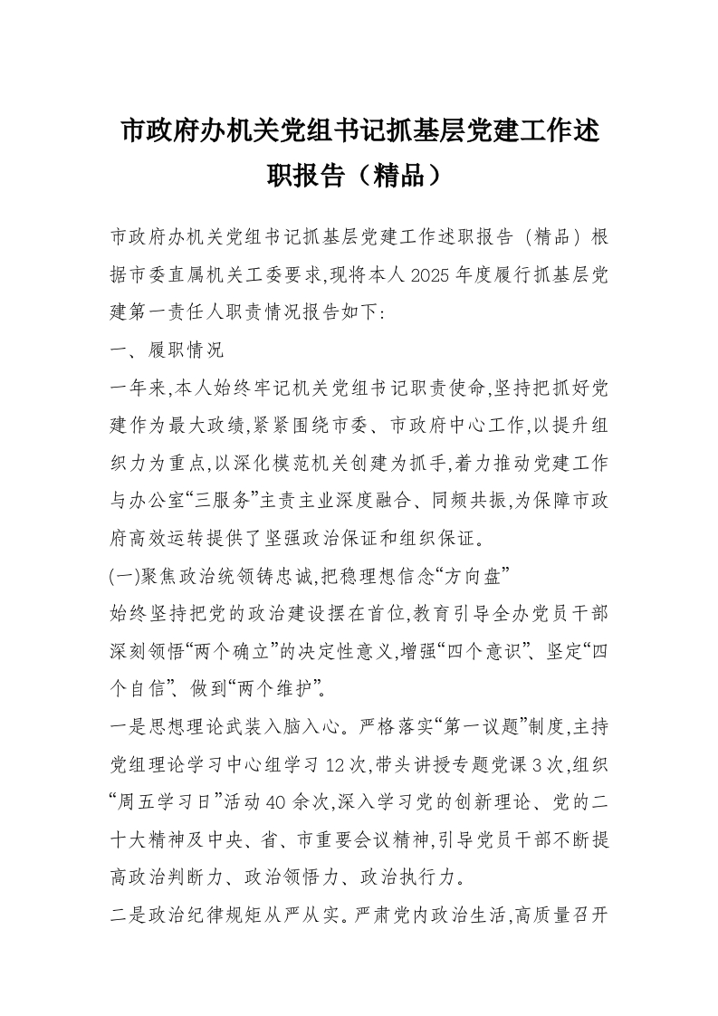 市***办机关党组书记抓基层党建工作述职报告(精品)