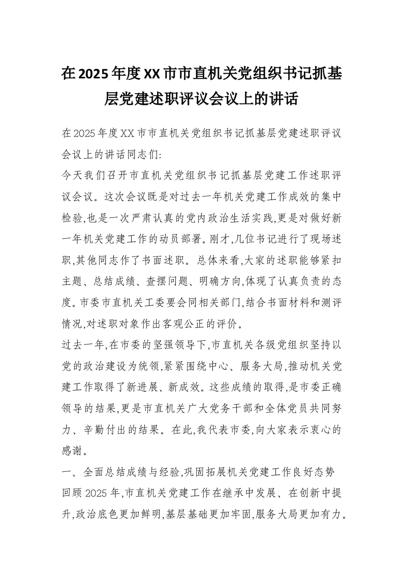 在2025年度XX市市直机关党组织书记抓基层党建述职评议会议上的讲话