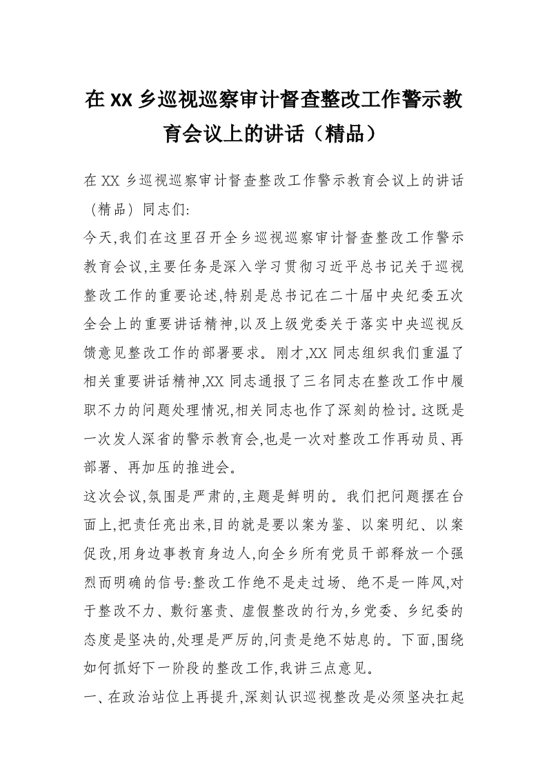 首页工作文档在XX乡巡视巡察审计督查整改工作警示教育会议上的讲话(精品)