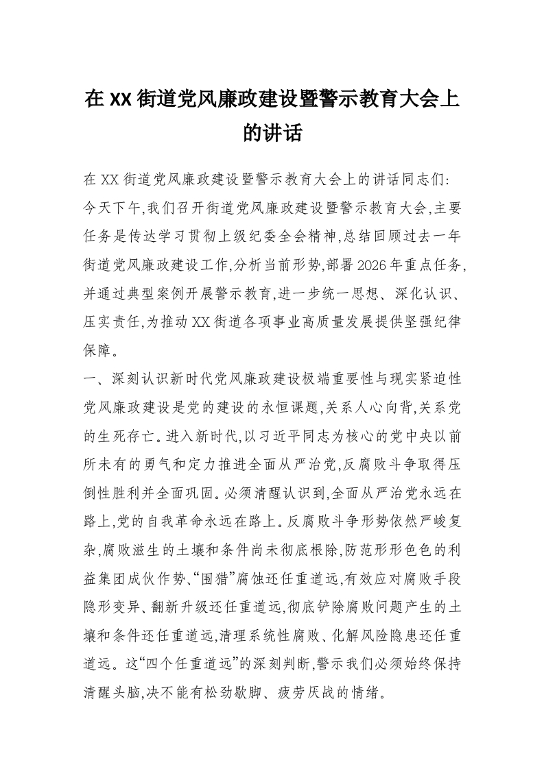 在XX街道党风廉政建设暨警示教育大会上的讲话