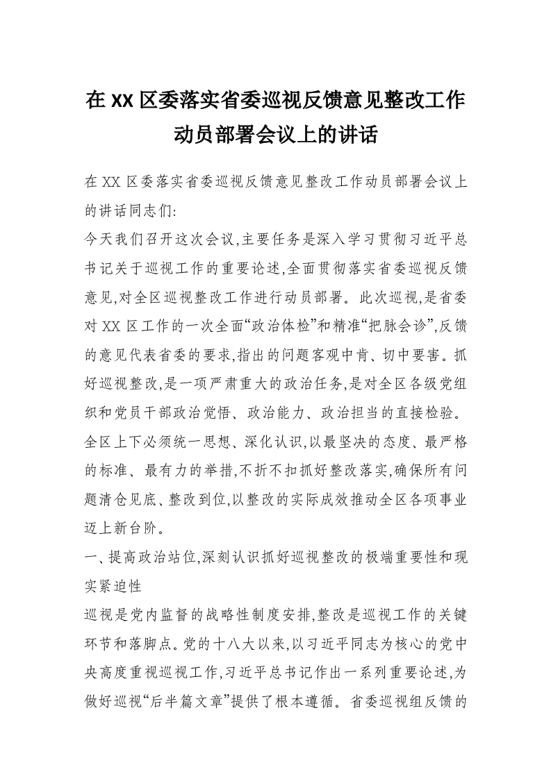 在XX区委落实省委巡视反馈意见整改工作动员部署会议上的讲话
