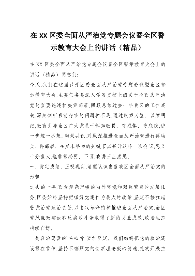 在XX区委全面从严治党专题会议暨全区警示教育大会上的讲话(精品)