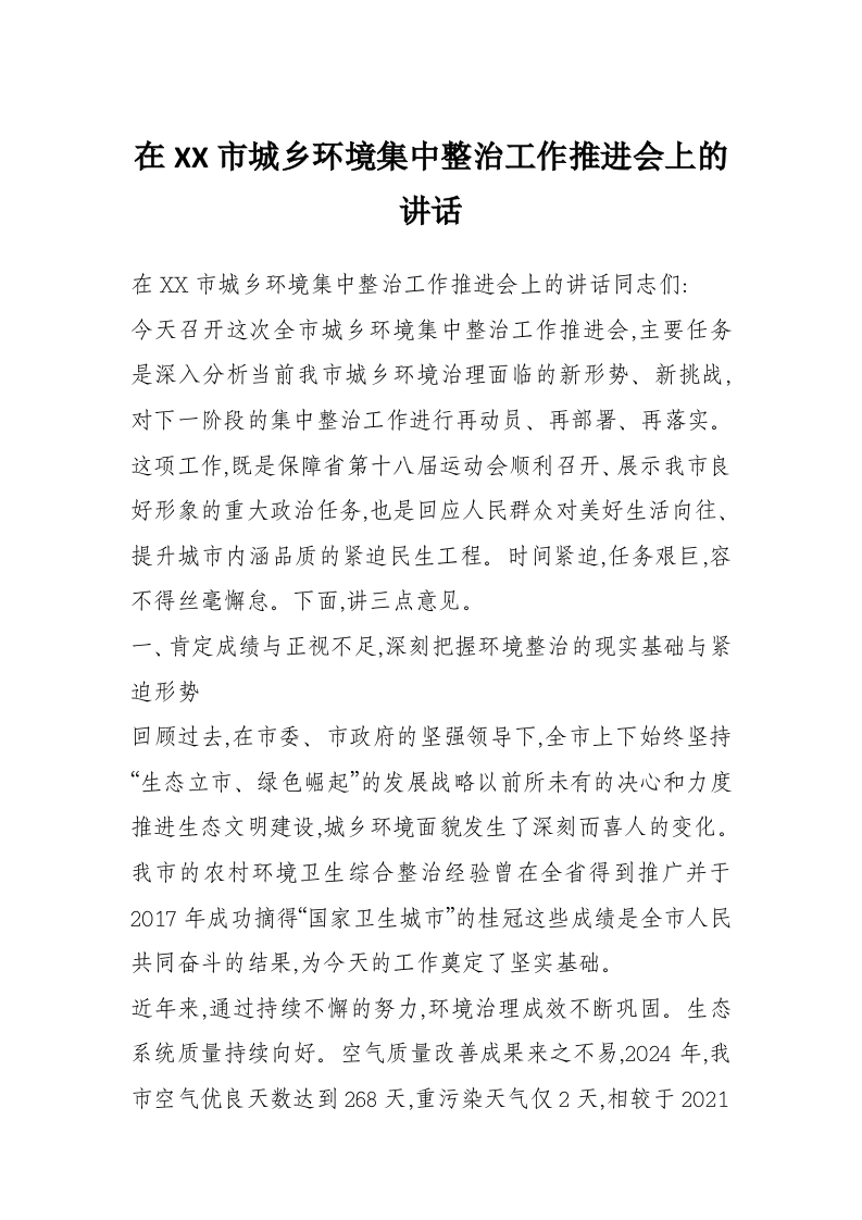 在XX市城乡环境集中整治工作推进会上的讲话