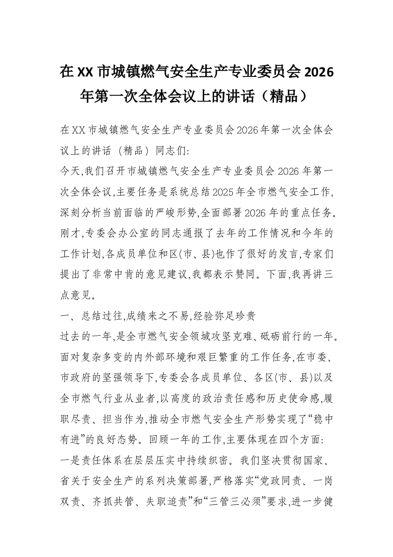 在XX市城镇燃气安全生产专业委员会2026年第一次全体会议上的讲话(精品)