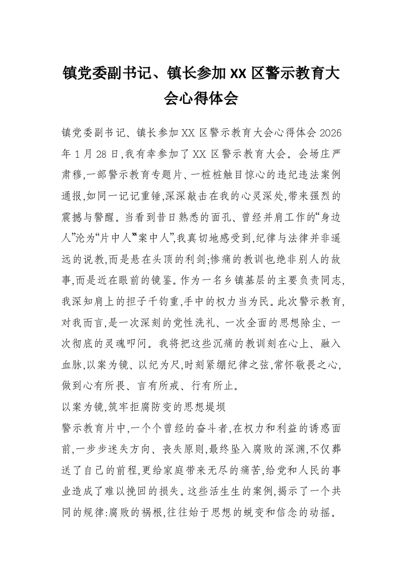 首页工作文档镇党委副书记、镇长参加XX区警示教育大会心得体会