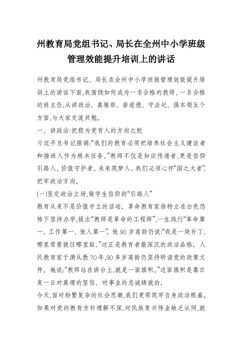 州教育局党组书记、局长在全州中小学班级管理效能提升培训上的讲话