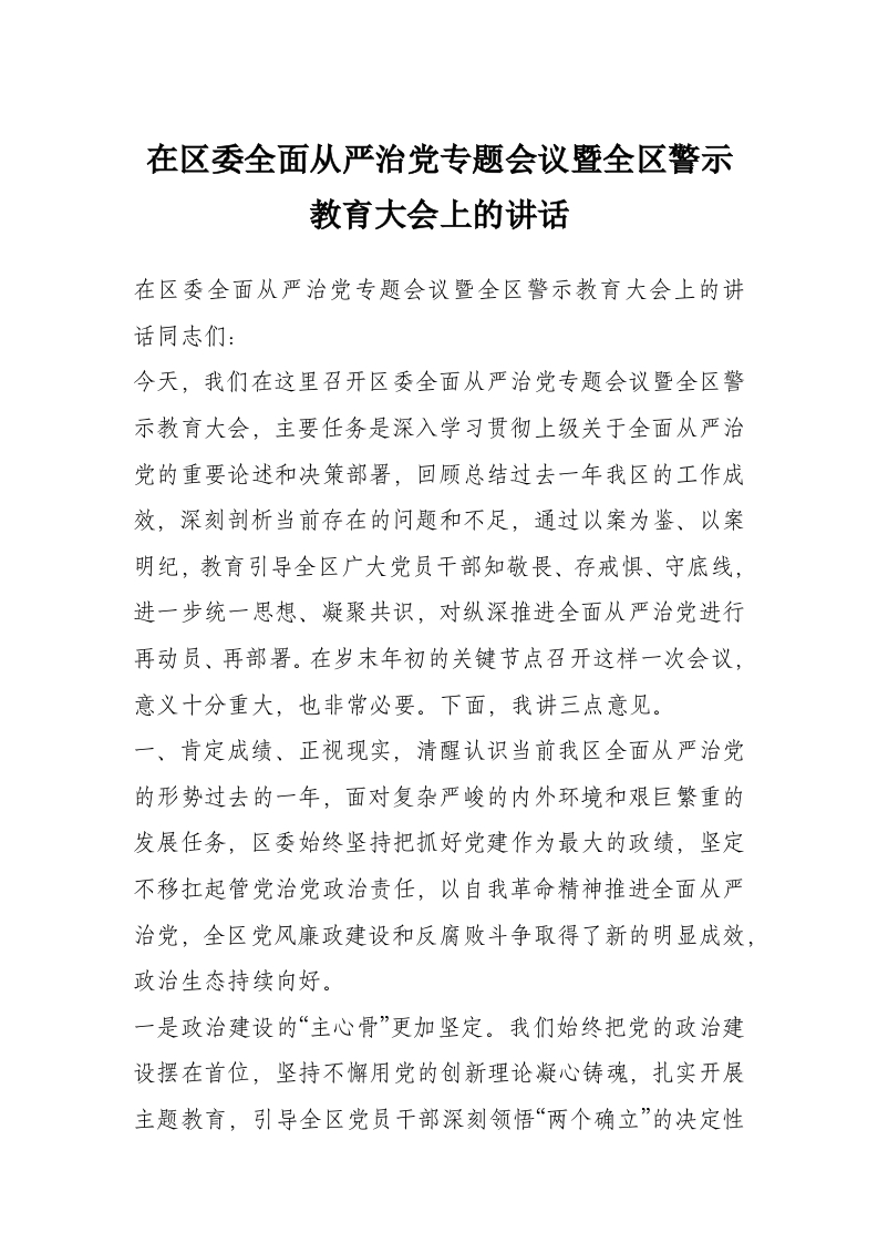 在区委全面从严治党专题会议暨全区警示教育大会上的讲话