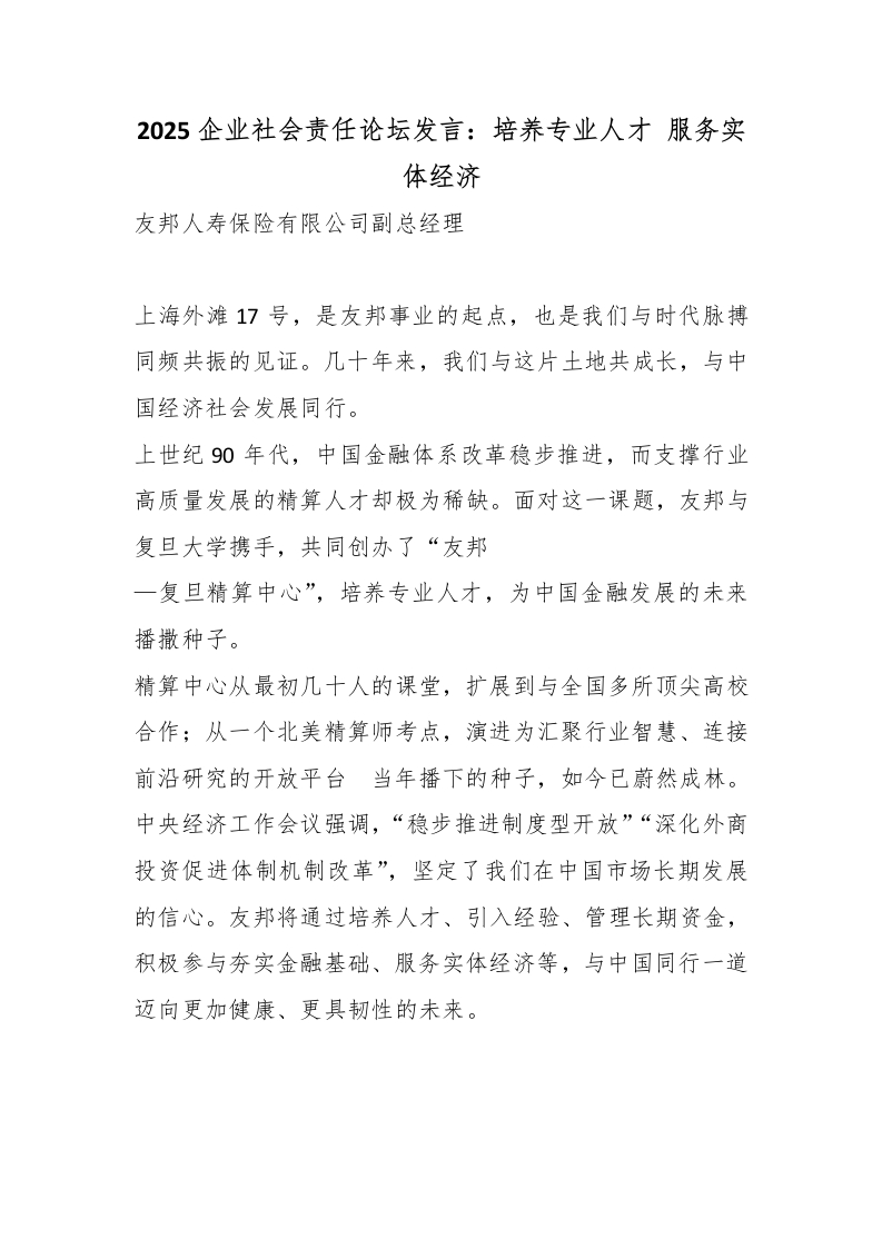 2025企业社会责任论坛发言:培养专业人才 服务实体经济