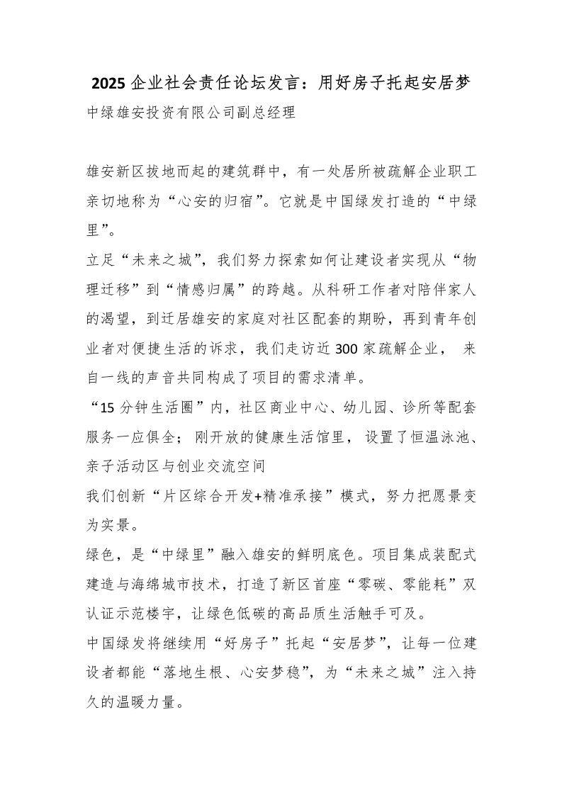 2025企业社会责任论坛发言:用好房子托起安居梦