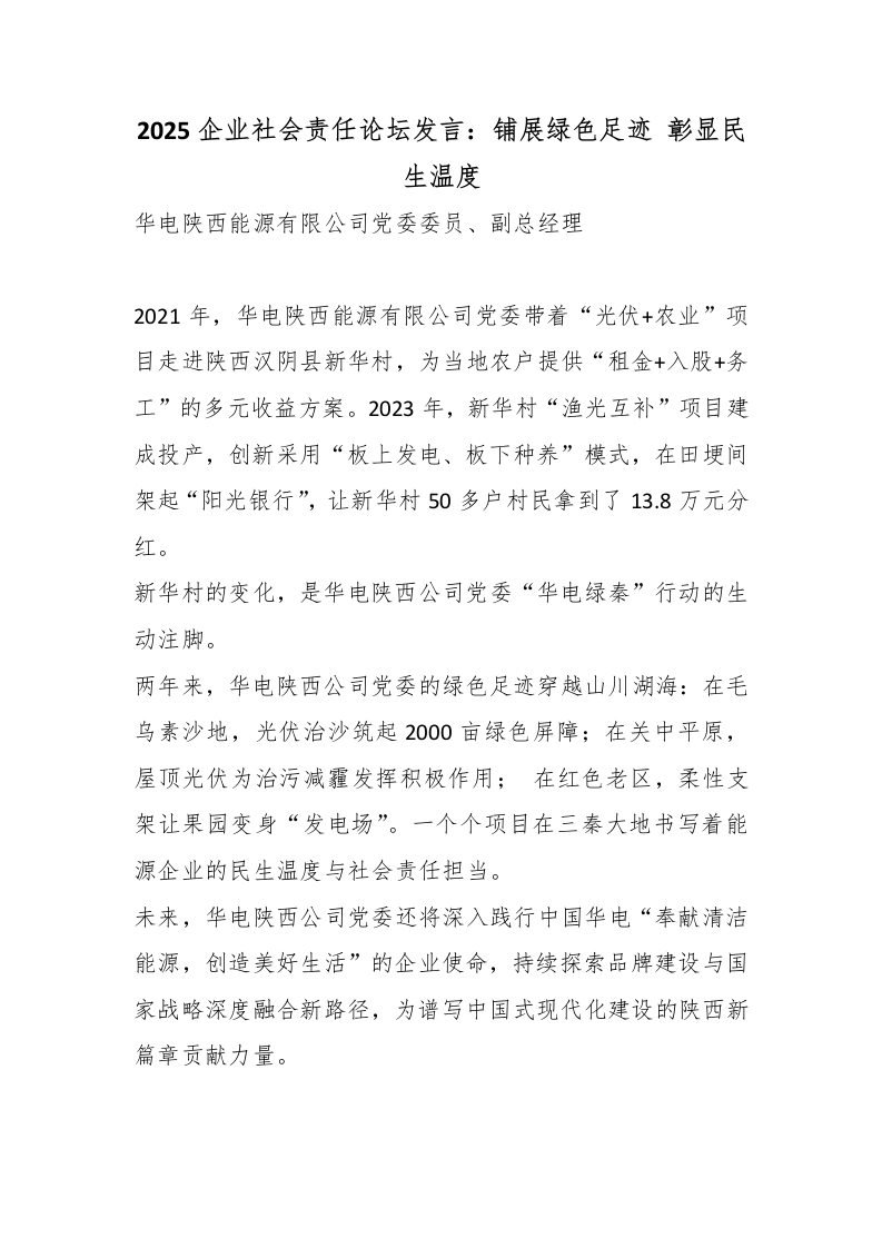 2025企业社会责任论坛发言:铺展绿色足迹 彰显民生温度