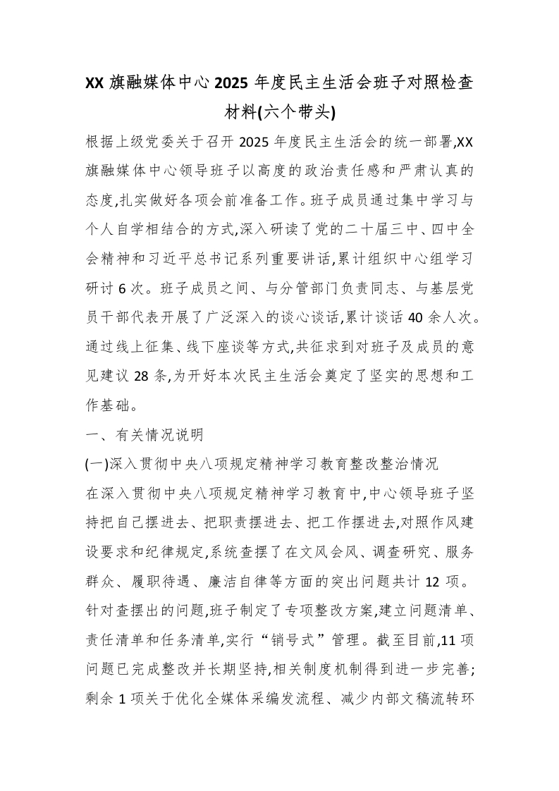 XX旗融媒体中心2025年度民主生活会班子对照检查材料(六个带头)
