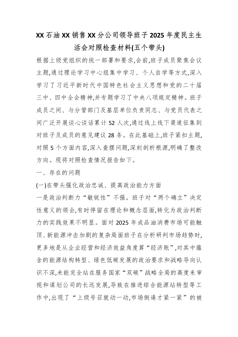 XX石油XX销售XX分公司领导班子2025年度民主生活会对照检查材料(五个带头)
