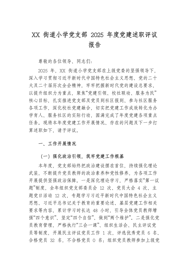 XX街道小学党支部2025年度党建述职评议报告