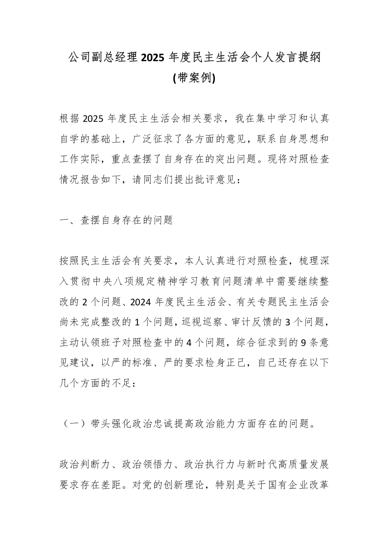 首页讲课讲稿公司副总经理2025年度民主生活会个人发言提纲(带案例)