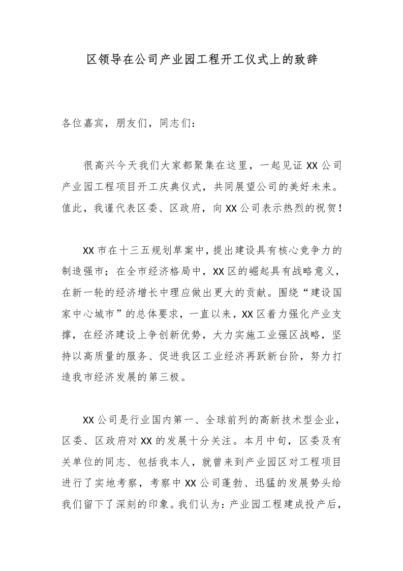区领导在公司产业园工程开工仪式上的致辞
