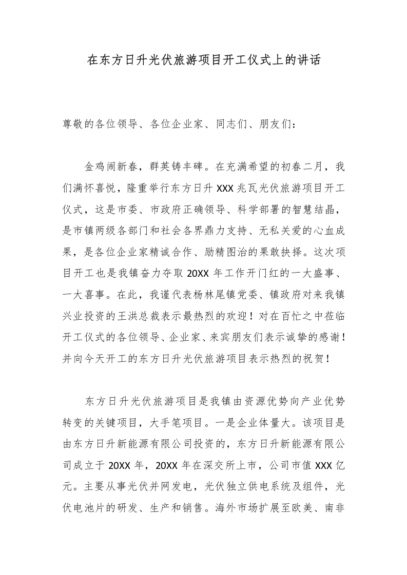 在东方日升光伏旅游项目开工仪式上的讲话