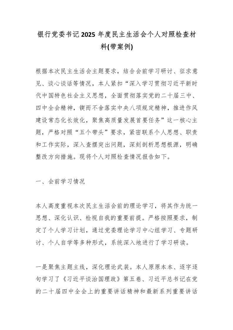 首页讲课讲稿银行党委书记2025年度民主生活会个人对照检查材料(带案例)