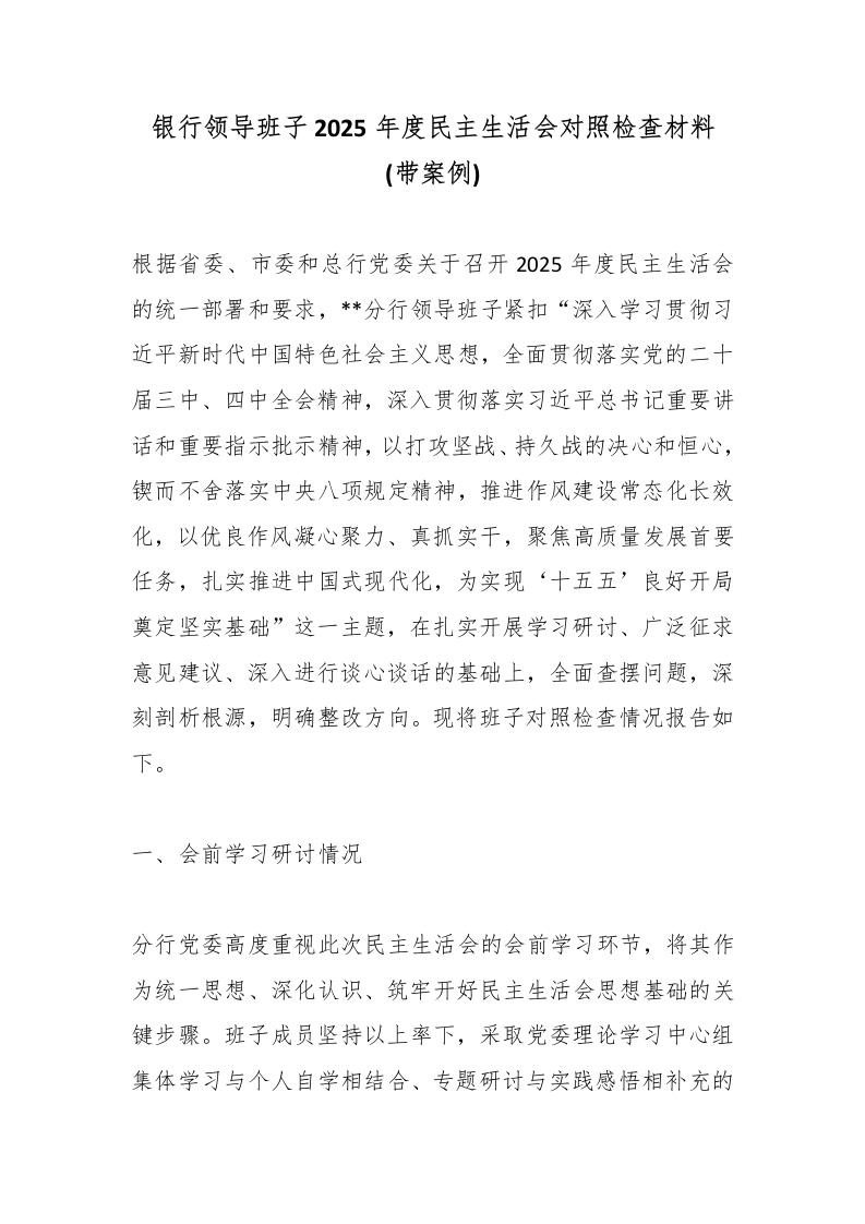 银行领导班子2025年度民主生活会对照检查材料(带案例)