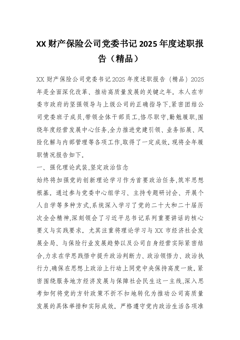 XX财产保险公司党委书记2025年度述职报告(精品)