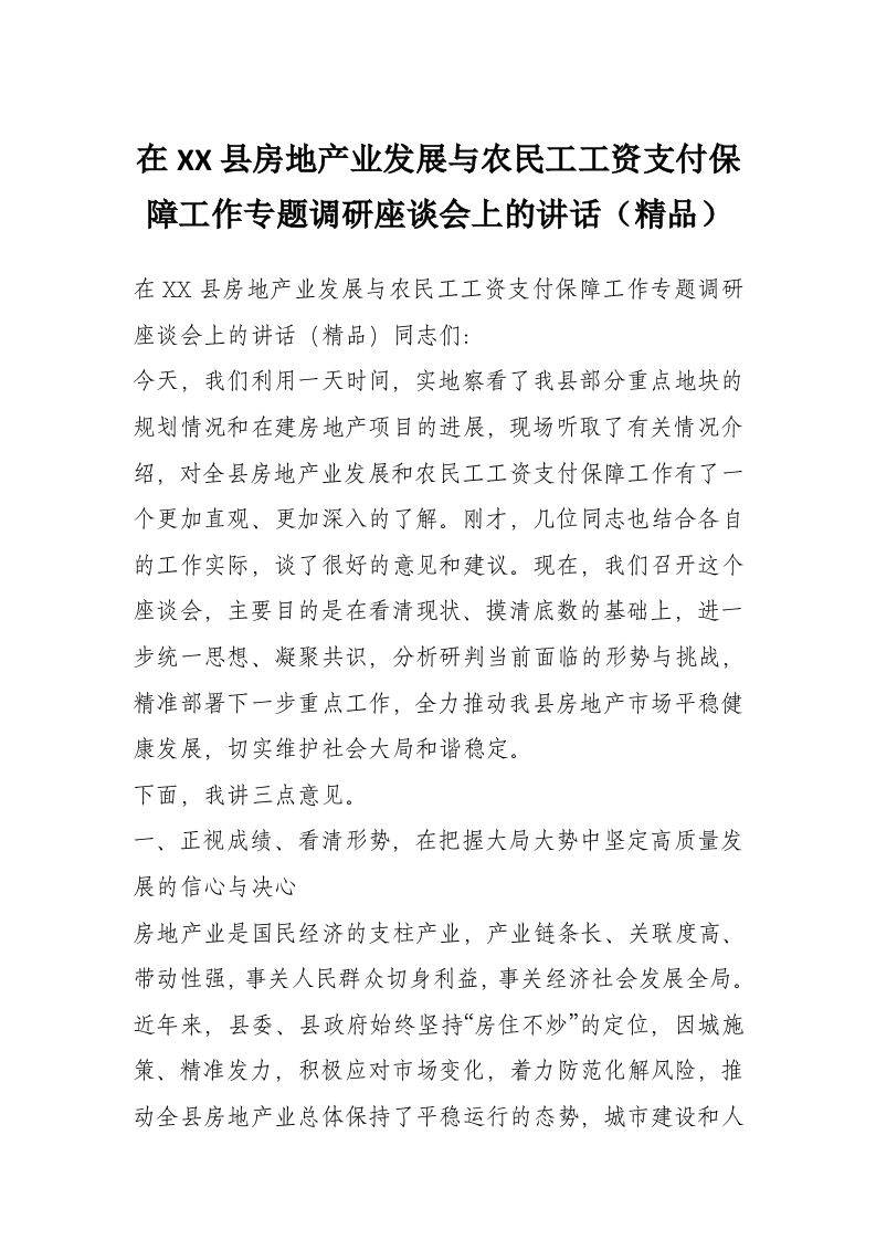 首页工作文档在XX县房地产业发展与农民工工资支付保障工作专题调研座谈会上的讲话(精品)