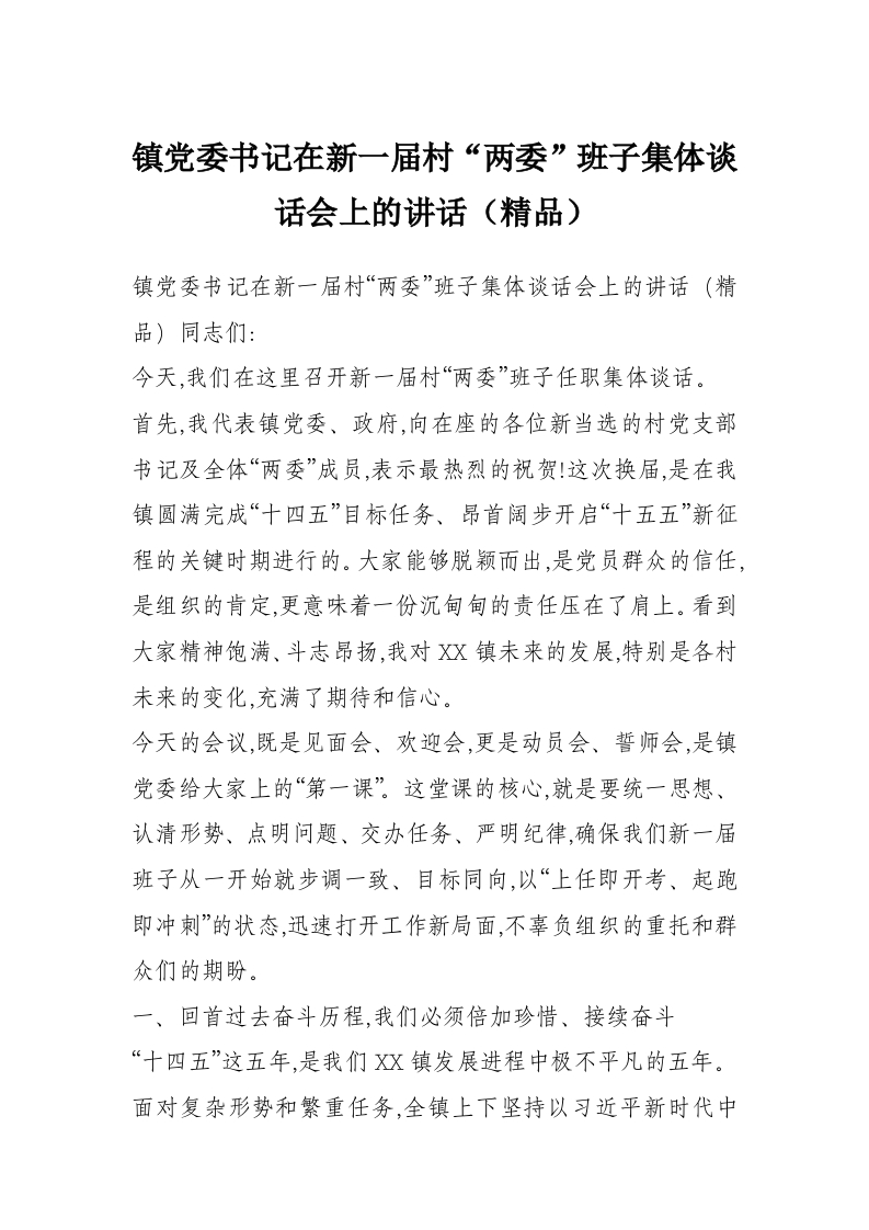 镇党委书记在新一届村“两委”班子集体谈话会上的讲话(精品)